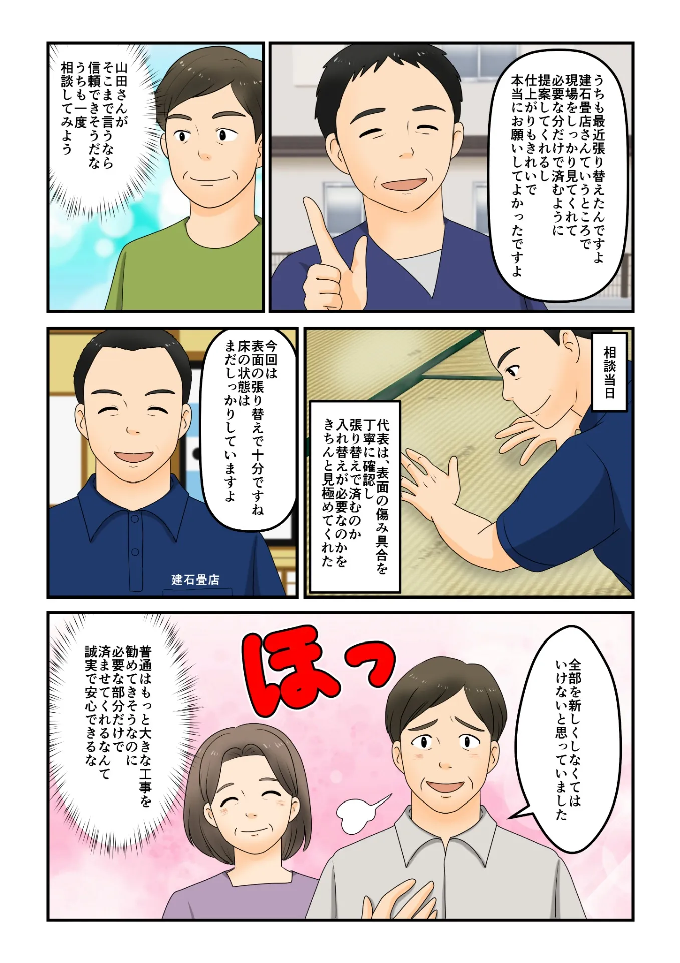 漫画特集 主人公「私は60代の田中。子どもたちも独立し、夫婦二人でのんびり暮らす日々が始まった」 主人公「ふと部屋を見渡すと、畳の色あせや傷みが気になった」 主人公「そろそろ畳をきれいにしなきゃなぁ」 …